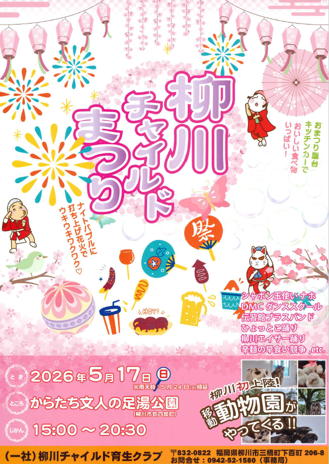 来月の5月17日(日)に柳川市の「からたち文人の足湯公園」にて「柳川チャイルドまつり」が開催されます。